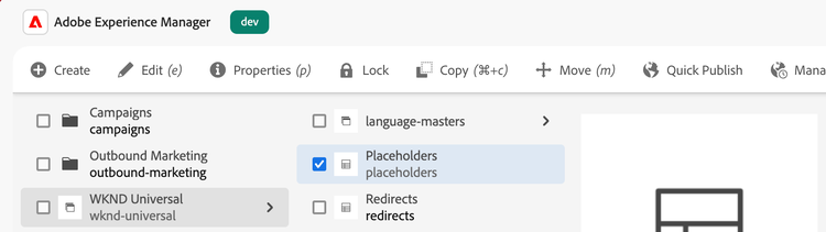 - From AEM Sites, open the Placeholders page of your site.