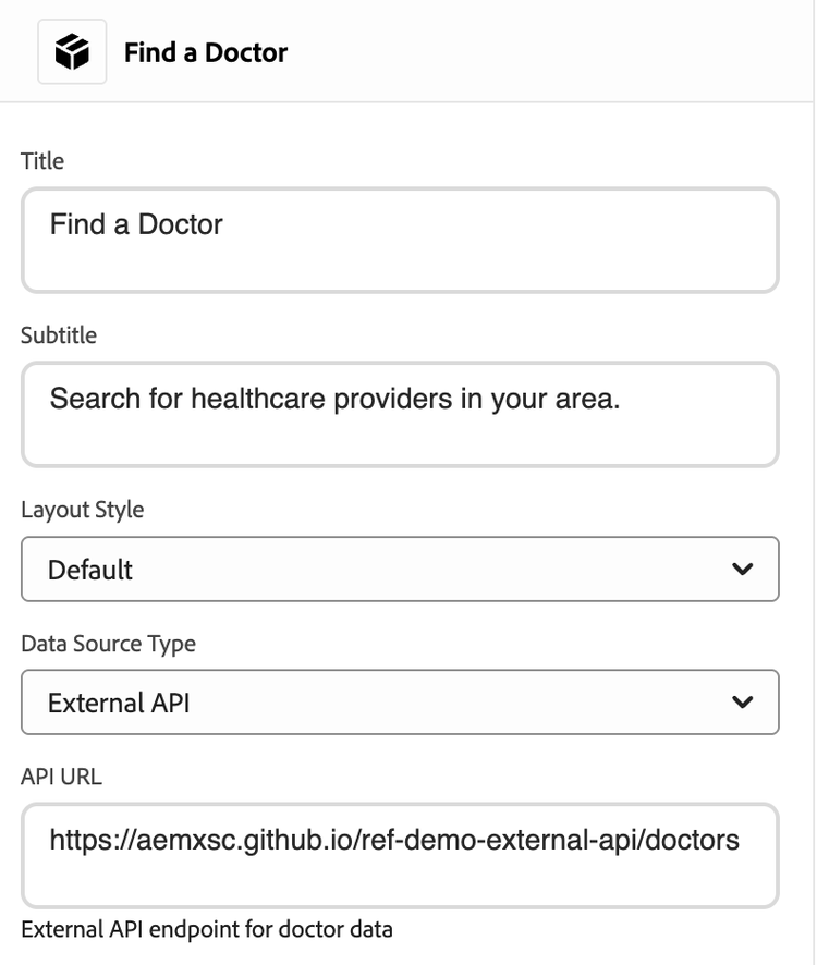 - External API: We could use an external API which contains all the information regarding the doctor. (e.g. https://aemxsc.github.io/ref-demo-external-api/doctors)