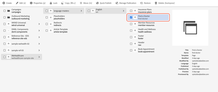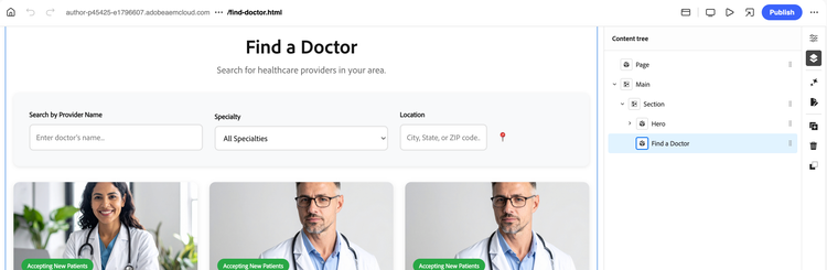 - Navigate to the content hierarchy and select the Find a Doctor block.