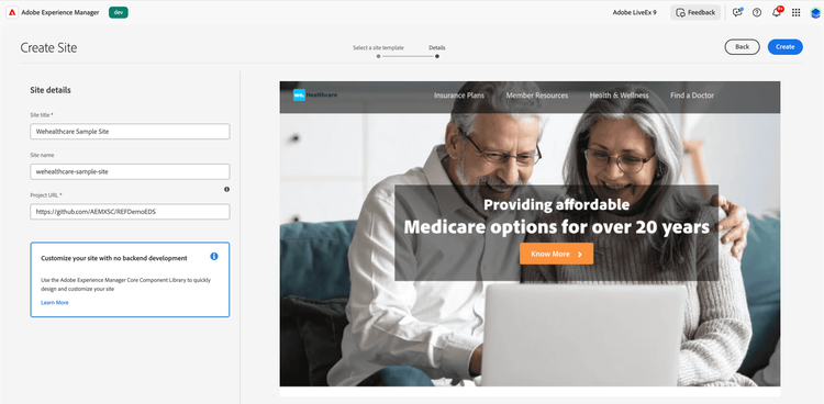 - Site Name: Use the same name exactly as you specified in the paths.json file in file in the previous step in the Git setup. e.g. wehealthcare-sample-site