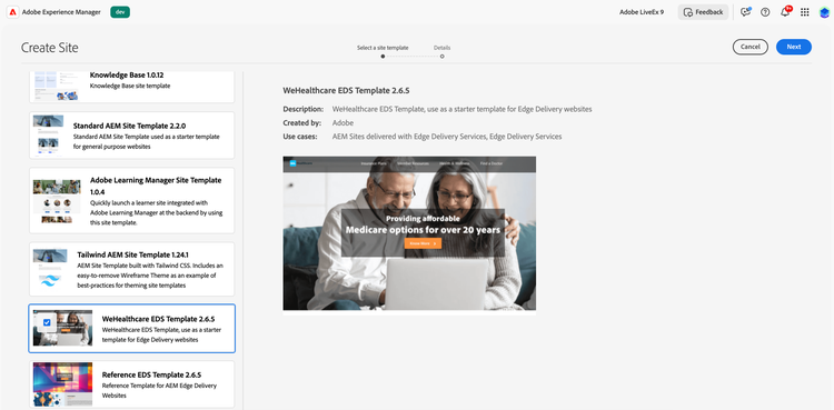 - Navigate to AEM Start Screen > Sites > Create > Site from template