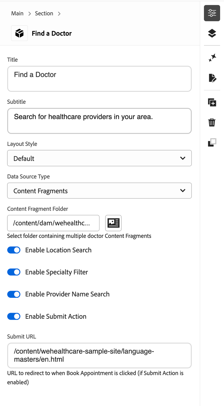 - Once you click on the properties icon, it will reflect a complete set of fields which you could author as per your need. Please find the description regarding the field appearing in Find a Doctor Block.