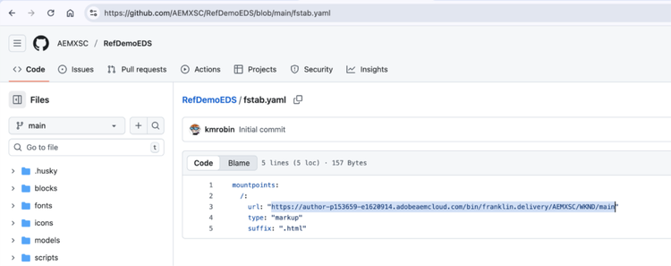 - In your cloned GitHub repo, update “fstab.yaml” file to point to your own AEM env and git location: