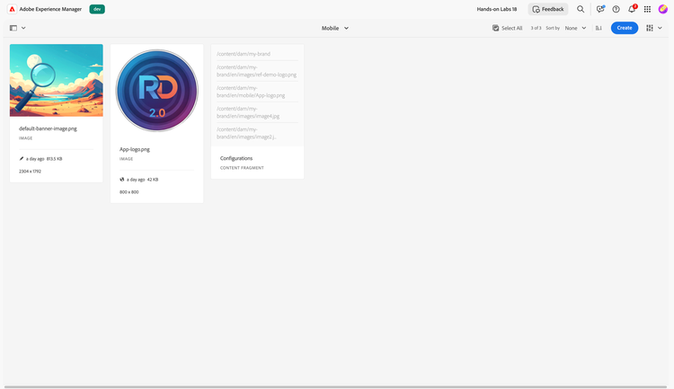 - In the Mobile folder find the Configuration fragment (this content fragment is responsible for driving the content pieces on the mobile app, as seen in the getting started page)