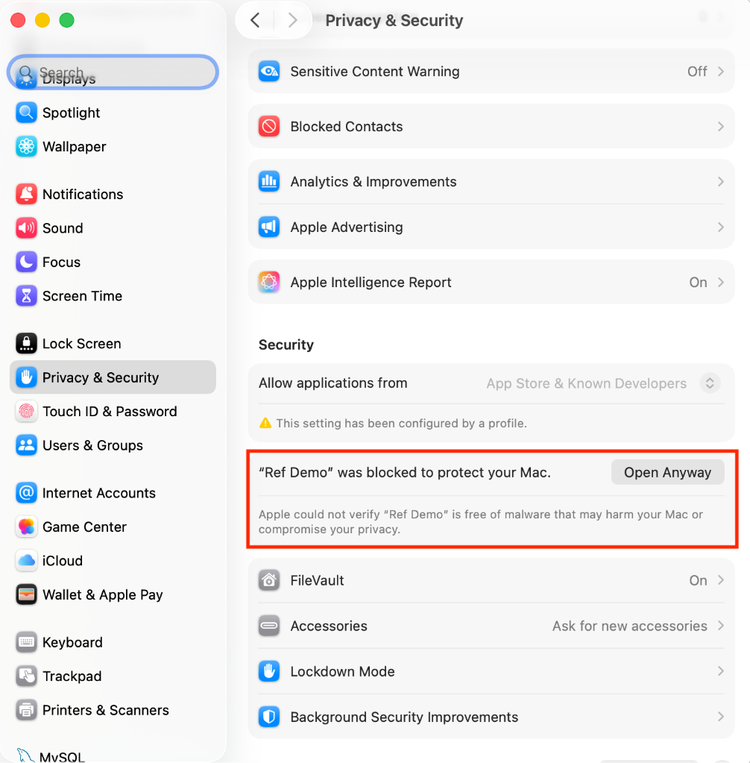 - You can trust the certificate by going to “System Settings > Privacy & Security > Security > Open Anyway”.