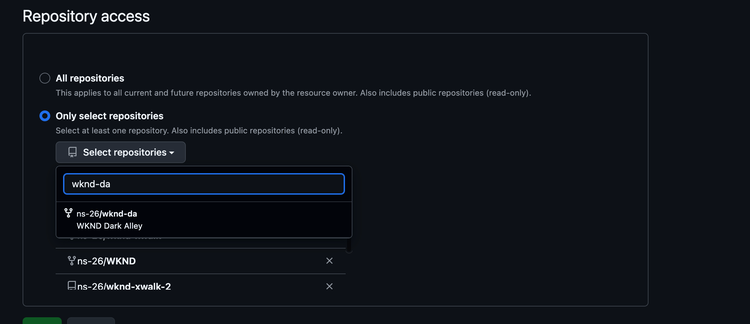 - In the Repository access settings of the AEM Code Sync App, make sure you select Only select Repositories (not All Repositories). Then select your newly created repository and click Save.