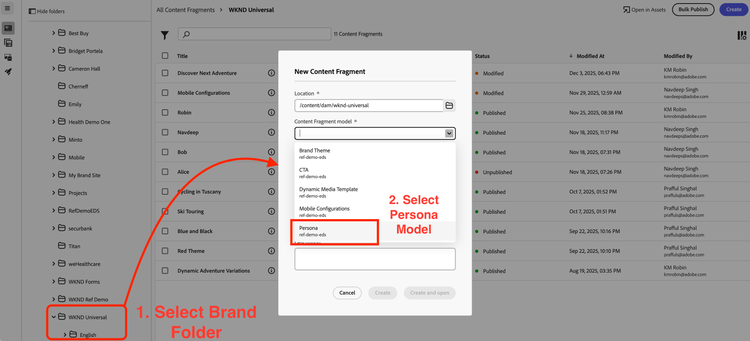 - Select your Brand Folder, e.g. “WKND Universal” where you want to create the Persona Fragment