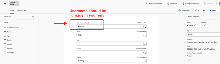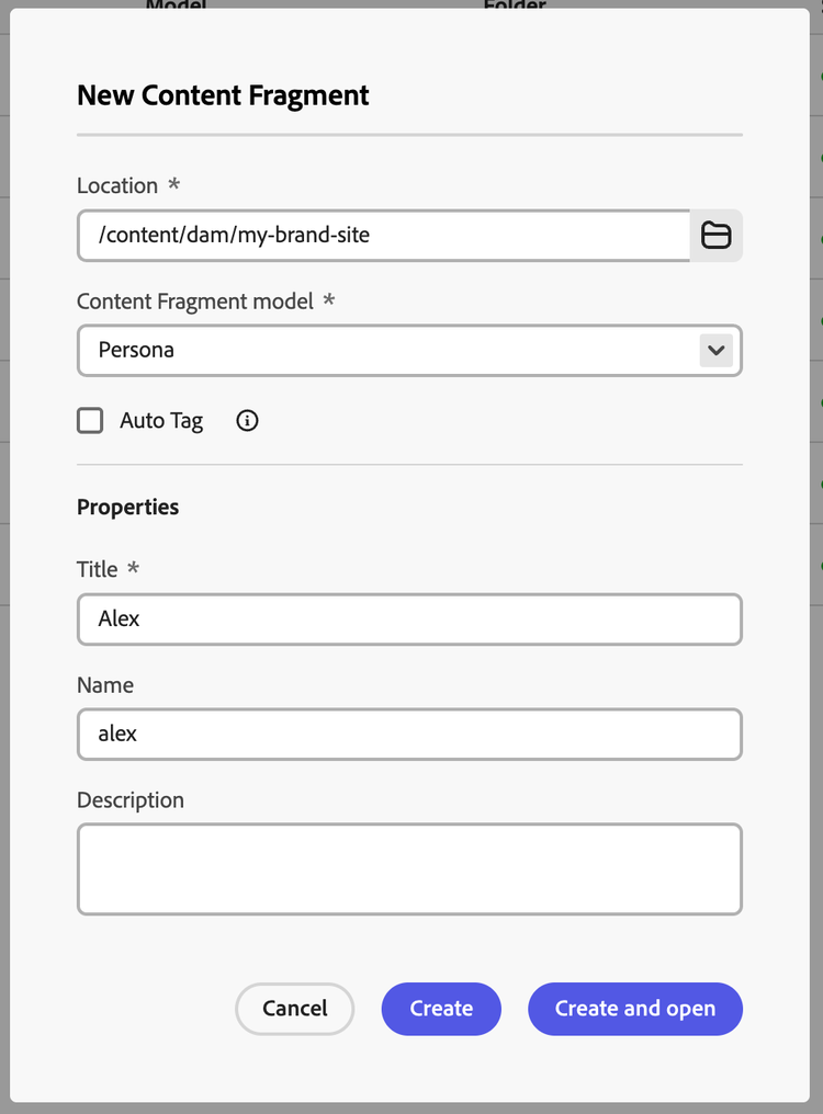 - Fill in the details suitably, select the Content Fragment Model as “Persona”