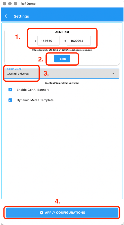 - Enter your AEM environment details > Click “Fetch” > Select your brand > Apply Configurations for your desired brand as done in previous modules.