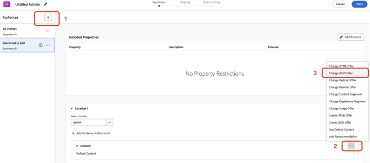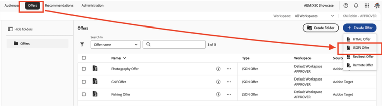 - Now, let’s define an Offer in Target. From top navigation in Adobe Target > Offers > Create Offer > JSON Offer
