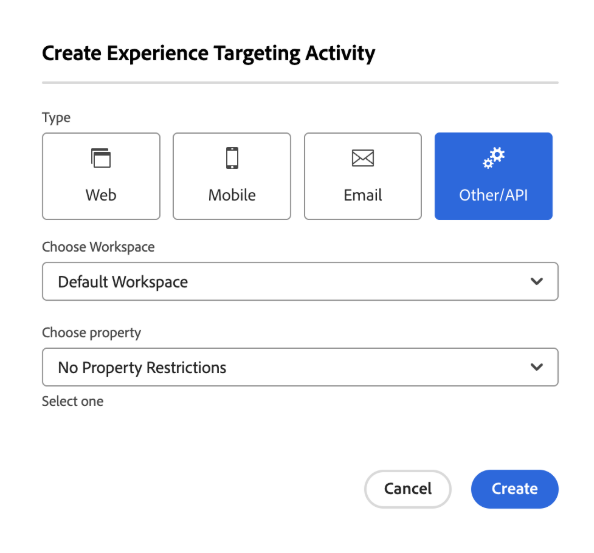- In the popup, choose option Other/API > Create