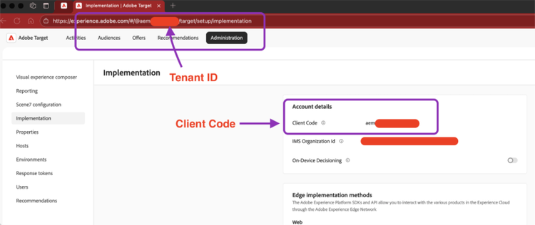 - From Adobe Target, you need to note down your “Client Code” and “Tenant ID” which you will enter in AEM configuration fragment later. (These two are generally the same but may be different in some legacy orgs).