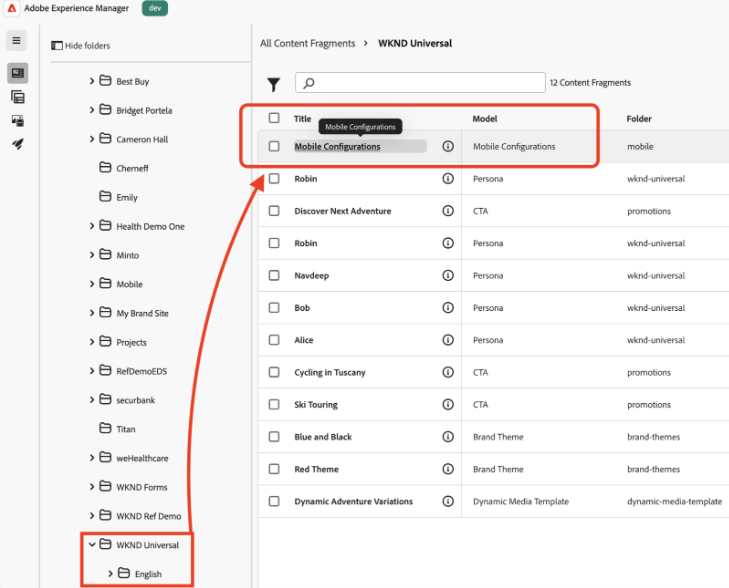 - Go back to your AEM Content Fragment list for your brand folder and open the “Mobile Configurations” fragment.