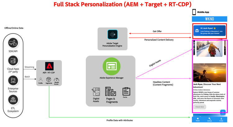 This flow integrates AEP (RT-CDP) profile attributes, AEM headless content, and Adobe Target decisioning, with the Mobile App consuming and rendering the personalized experience.