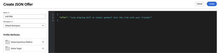 - Give your offer a name and in json window enter an “offer” message you want to show for personas who qualify your audience criteria and click “Create”.