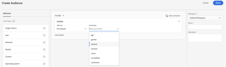 - Choose a parameter (if not available in dropdown, type your parameter directly). The parameter should be same (case-sensitive) as you had in the Persona fragment earlier in AEM e.g. “interest”, etc.