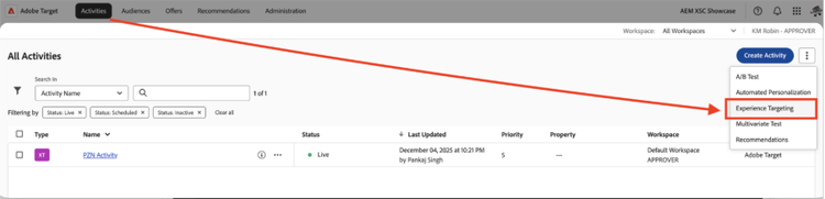 - Finally, let’s create the activity to map the Audience & Offer. From top navigation in Adobe Target > Activities> Create Activity> Experience Targeting
