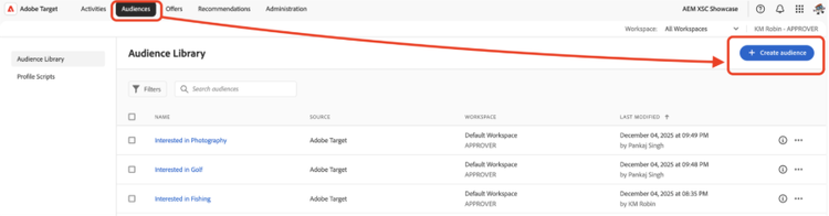 - Let's head back to Aobe Target and navigate to Target > Audiences from the top navigation and let’s “Create Audience”.
