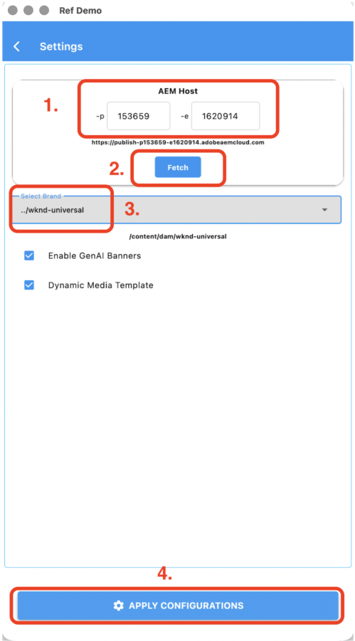 - Enter your AEM environment details > Click “Fetch” > Select your brand > Click Apply Configurations.