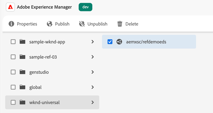 - Expand “wknd-universal” > select the config > click “Properties” in ribbon